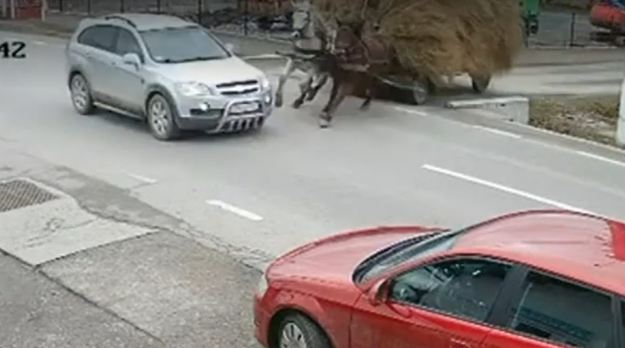 Evenimentul a avut loc în localitatea Bistrița Bârgăului și a fost surprins de camerele de supraveghere din zonă. Căruța încărcată cu fân, trasă de doi cai, iese în viteză de pe un drum lateral și ajunge direct în fața unui autoturism care circula regulamentar.