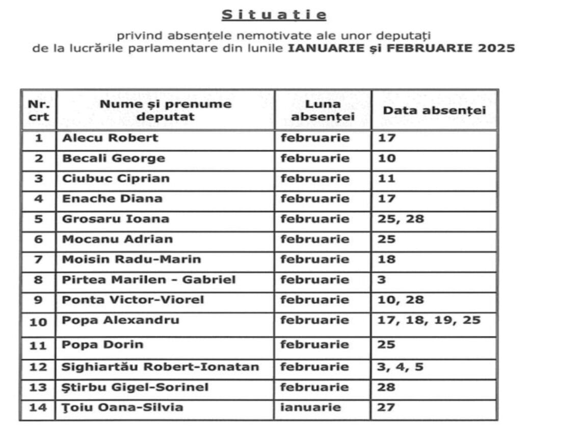 În total, 14 deputați apar pe lista absențelor nemotivate pentru perioada ianuarie-februarie 2025. Singura absență raportată pentru luna ianuarie aparține deputatei Toiu Oana-Silvia, în data de 27 ianuarie.