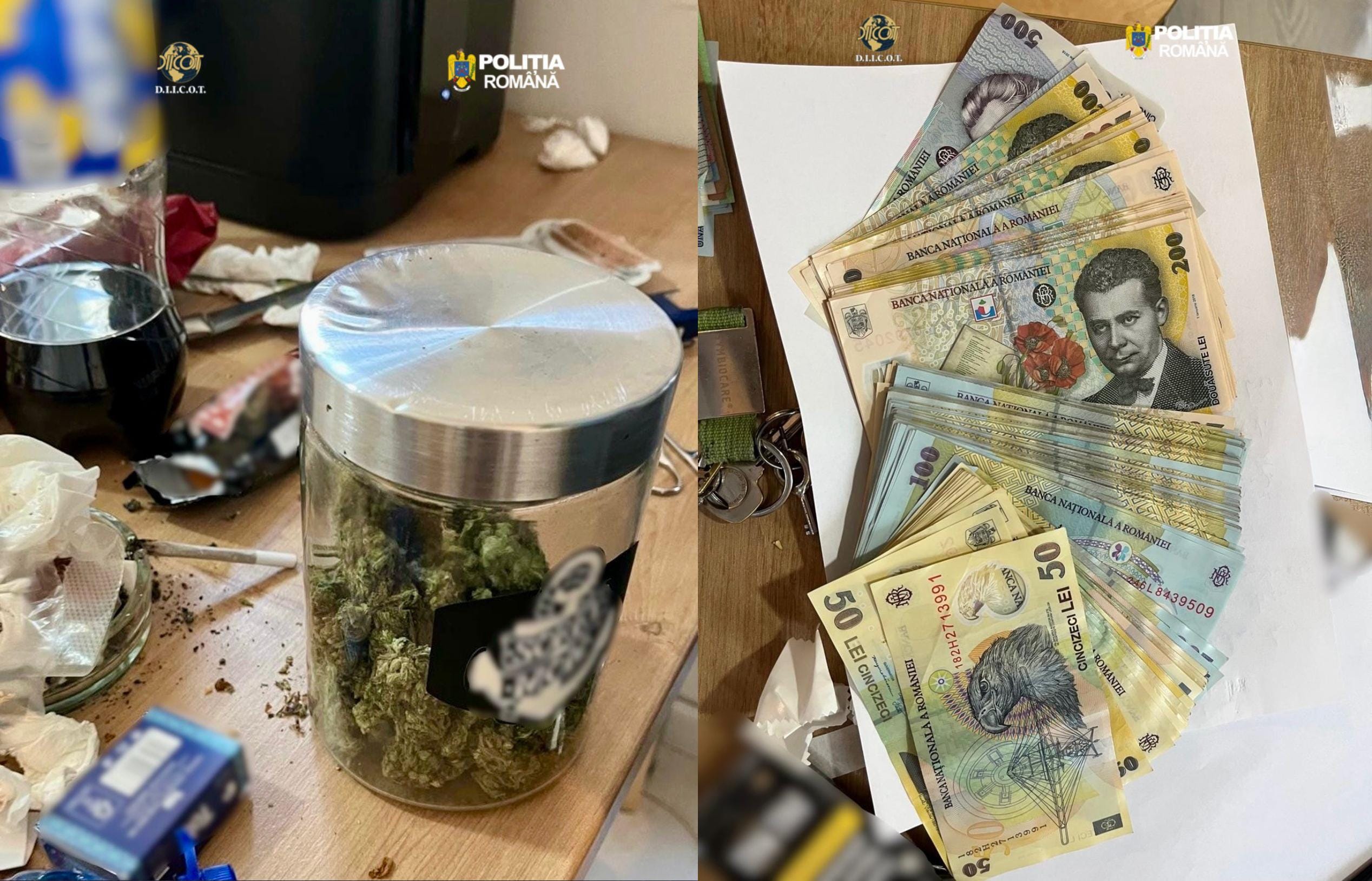 Au fost ridicate aproximativ 1,2 kilograme de canabis și 100 de grame de cocaină, precum și obiecte purtând urme de substanță, un grinder și un cântar electronic de mare precizie, folosite pentru porționarea drogurilor.