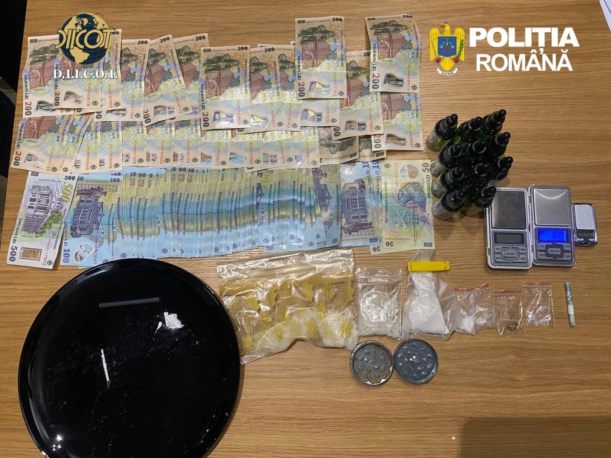 DIICOT! Substanțe periculoase, bani și cântare de precizie ridicate la percheziții. Un bărbat, arestat preventiv