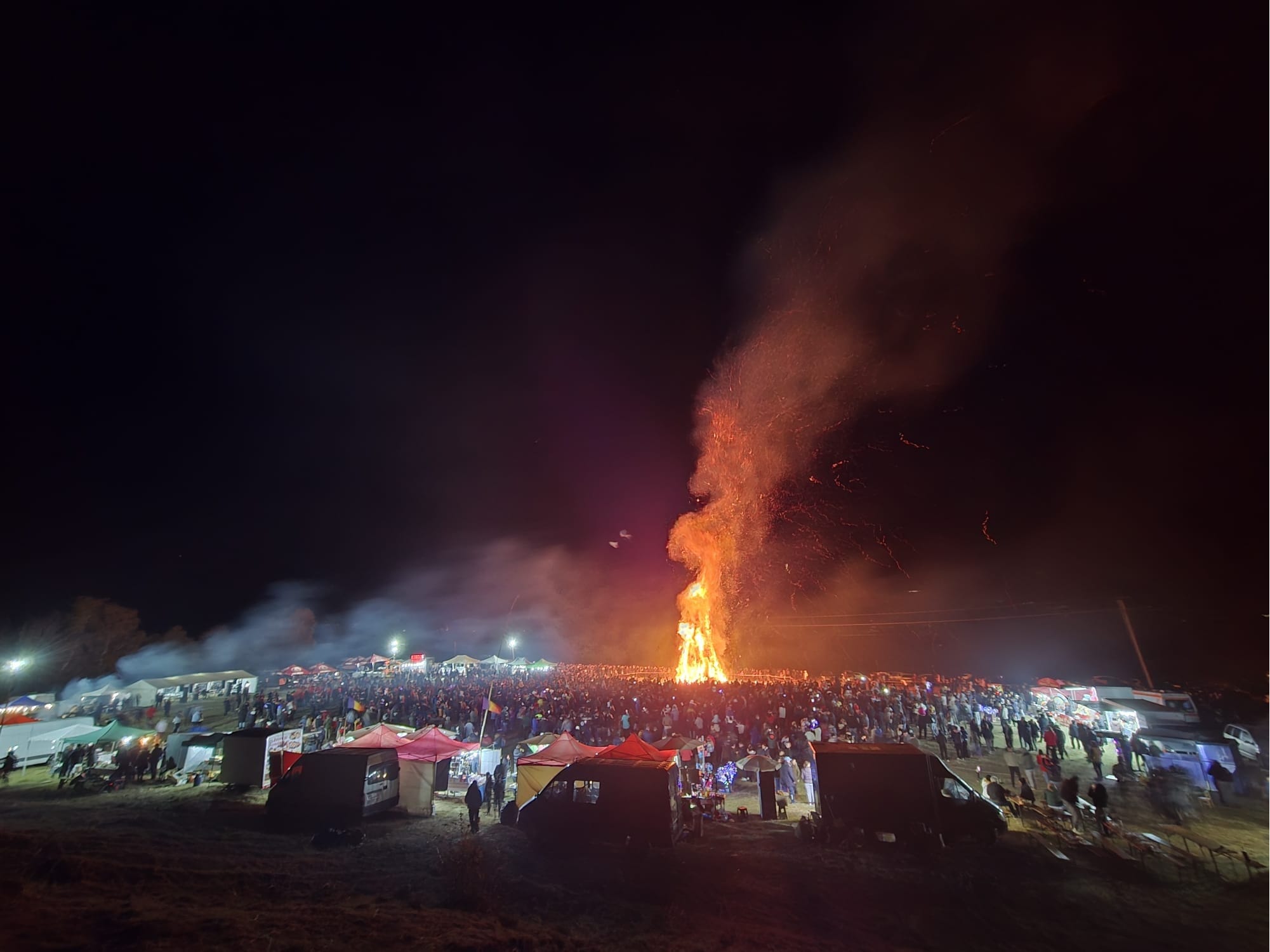 De sus, focul este văzut de departe, iar an de an, spectacolul este și mai mare. Sâmbătă de la ora 15.00, mașinile au început să urce la Mățău. Până la ora la care se anunțase că se va aprinde focul, ora 20.00, se strânseseră pe deal peste 2000 de persoane, mașinile au fost parcate inclusiv pe strada principală, pentru că parcarea s-a umplut rapid. Surprizele din acest an au fost terasele unde micii, pulpele de pui, ceafa de porc sau cârnații sfârâiau, vinul fiert, țuica fiartă, sau berea completau gustările.