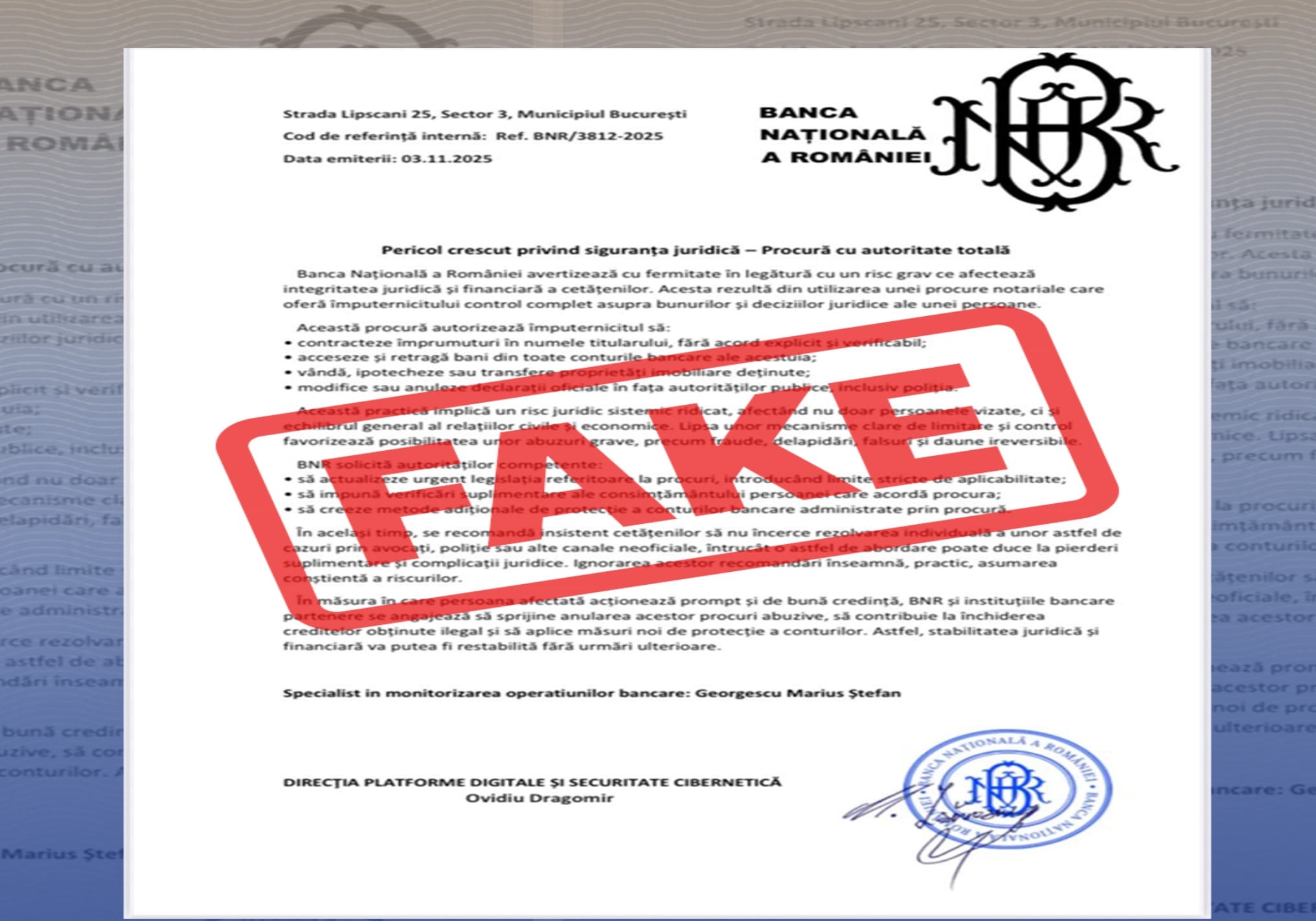 Guvernatorul BNR avertizează: un document care circulă online, atribuit instituției, este fals. Banca Națională a României avertizează publicul cu privire la un document fals care circulă în mediul online sub denumirea „Pericol crescut privind siguranța juridică – Procură cu autoritate totală” și care poartă sigla și antetul instituției. Documentul, datat 03.11.2025, nu a fost emis, aprobat sau semnat de BNR, subliniază reprezentanții instituției.