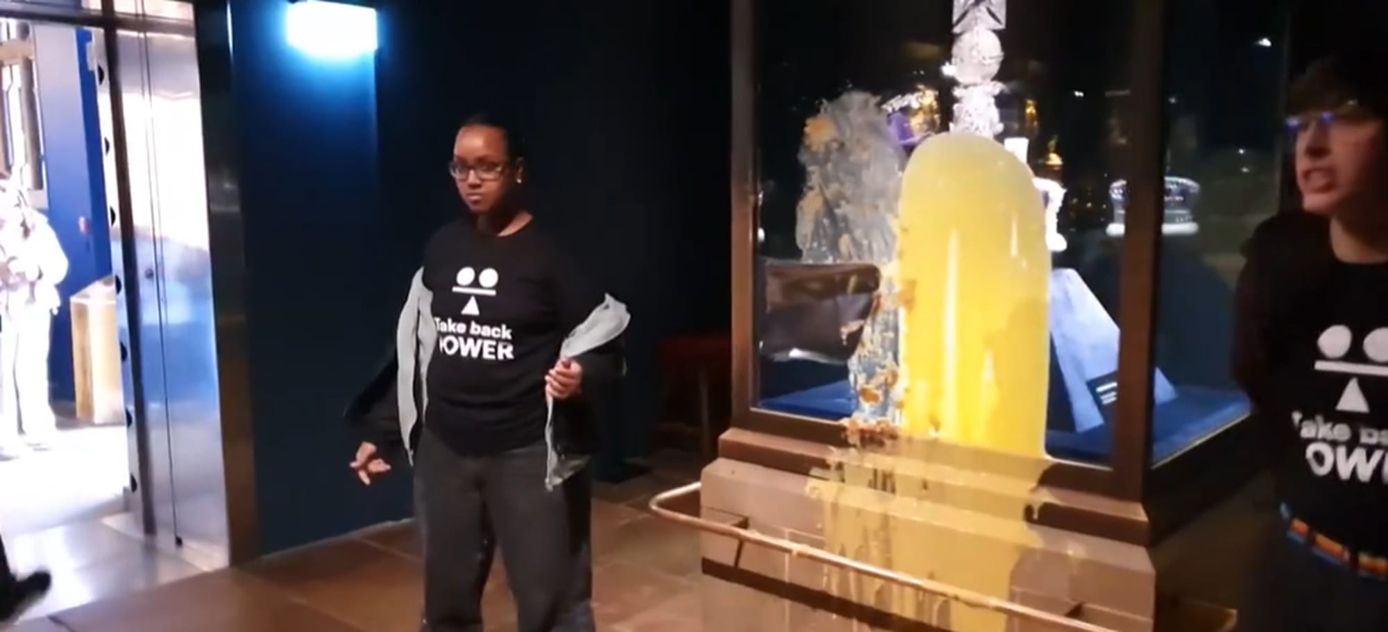 Imaginile postate pe rețelele sociale au surprins un protestatar aruncând crumble de mere într-o vitrină, urmat de altcineva care a turnat cremă galbenă strălucitoare peste geamul care proteja Coroana Imperială.