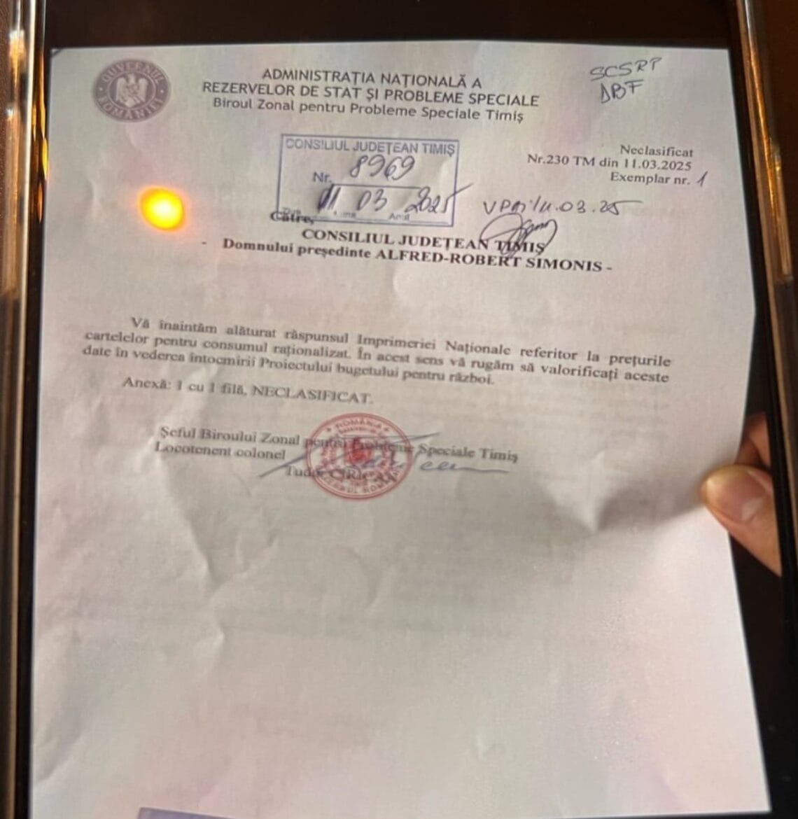 Documentul era transmis de Administrația Națională a Rezervelor de Stat și Probleme Speciale, către Consiliul Județean Timiș și președintelui Alfred Simonis cu textul: