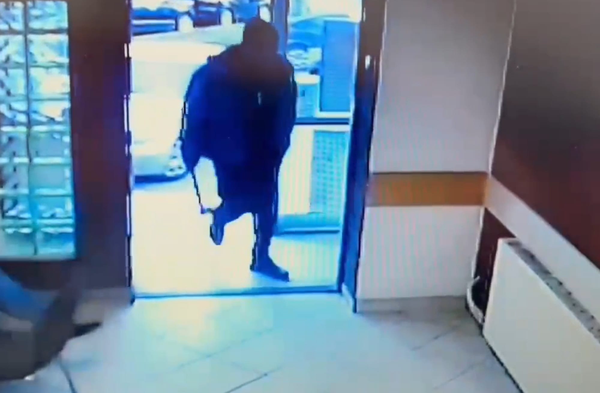Imaginile surprinse de camerele de supraveghere arată cum individul intră în local cu toporul în mână și îl ridică deasupra capului, într-un gest amenințător.