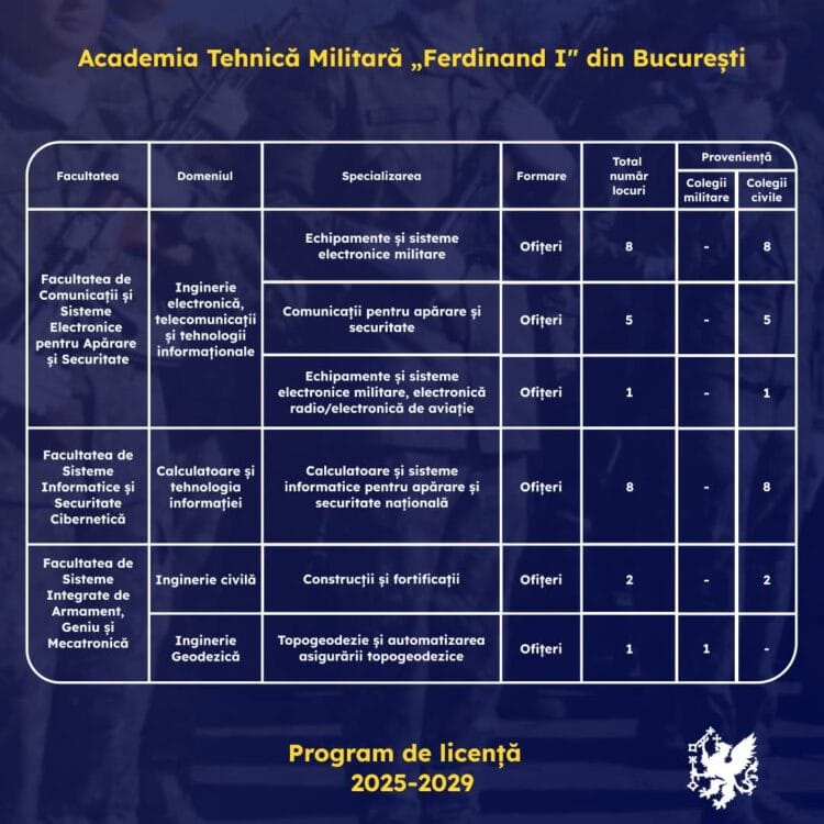 Am prelungit perioada de înscriere, până la data de 04 aprilie 2025, pentru locurile scoase la concurs în cadrul următoarelor instituții militare de învățământ: