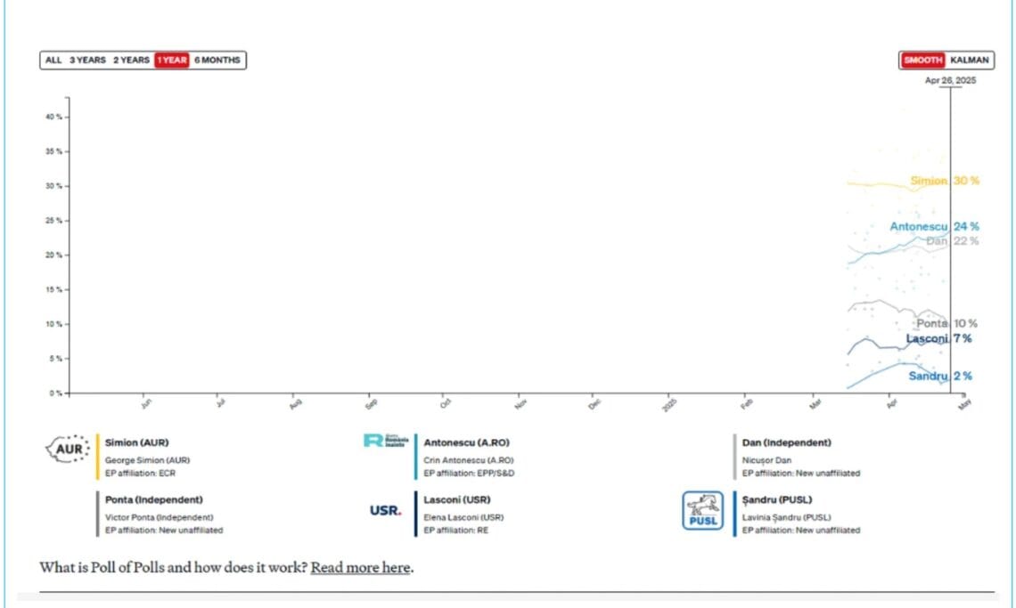 Amintim că ultimul sondaj SOCIOPOL (institut condus de Mirel Palada, fost purtător de cuvânt în guvernul Ponta) arată că George Simion și Victor Ponta conduc cursa pentru funcția supremă, iar Crin Antonescu se clasează pe locul trei, la egalitate cu Nicușor Dan.