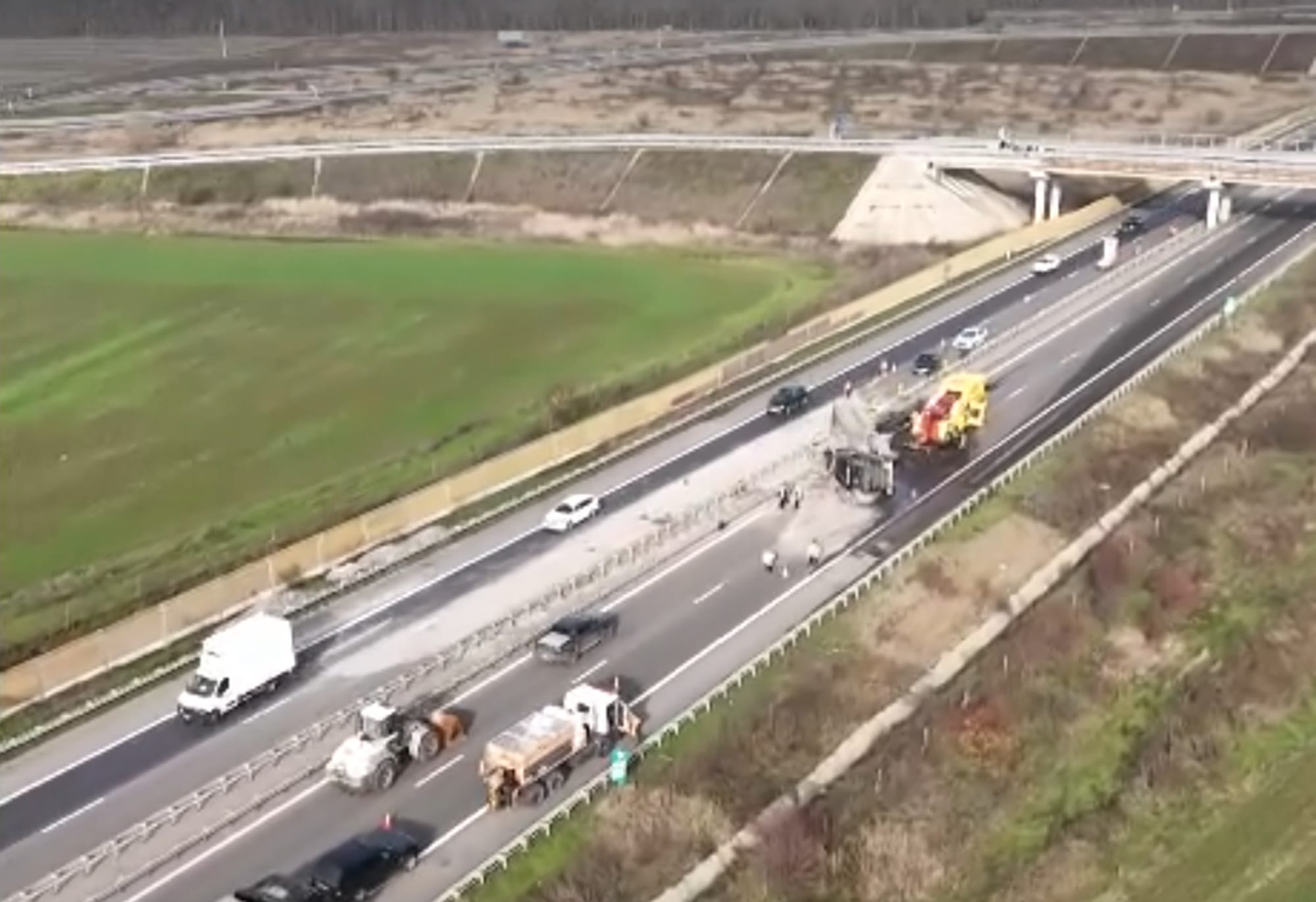Încărcat cu piatră, camionul s-a răsturnat pe o parte, rupând complet glisierele metalice dintre sensuri. Din fericire, în momentul în care vehiculul a ajuns pe contrasens, nu s-a lovit de alte autoturisme aflate în trafic.
