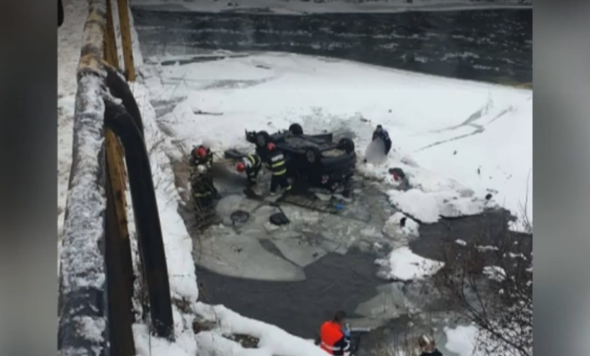 Scenele surprinse la fața locului au fost dramatice: mașina zăcea răsturnată pe cupolă, pe stratul de gheață format pe râu, iar echipele de salvare interveneau pentru a scoate ocupanții din vehicul.
